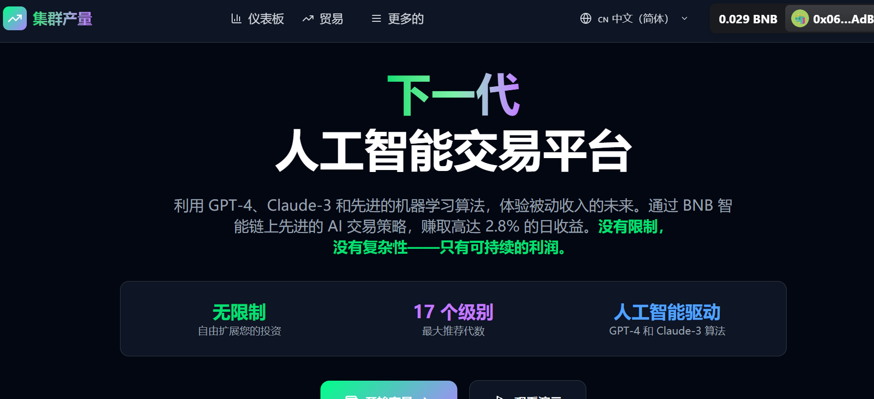 本页总览clusteryield备注博主投入:💲1️⃣0️⃣提示HM指数:3️⃣.6️⃣3️⃣HM指数是什么❓🤔 点击我了解👈信息2025年7月2日计划: 每日 0.7% - 2.8%,持续 7 天 - 180 天 最低存款: 10美元 最低支出: -- 付款类型: 立即的 支付系统: Tether, Binance Coin ®️立即访问 关于下一代 人工智能交易平台 利用 GPT-4、Claude-3 和先进的机器学习算法,体验被动收入的未来。通过 BNB 智能链上先进的 AI 交易策略,赚取高达 2.8% 的日收益。没有限制, 没有复杂性——只有可持续的利润。®️立即访问